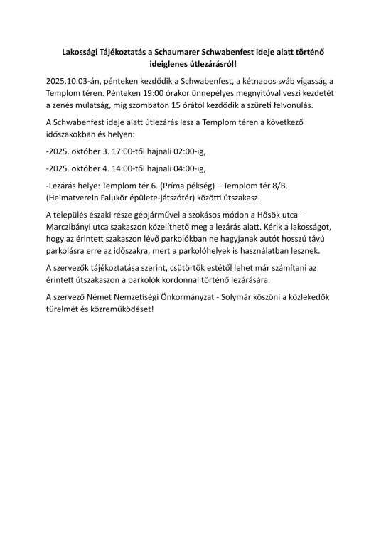 Lakossági Tájékoztatás a Schaumarer Schwabenfest ideje alatt történő ideiglenes útlezárásról!