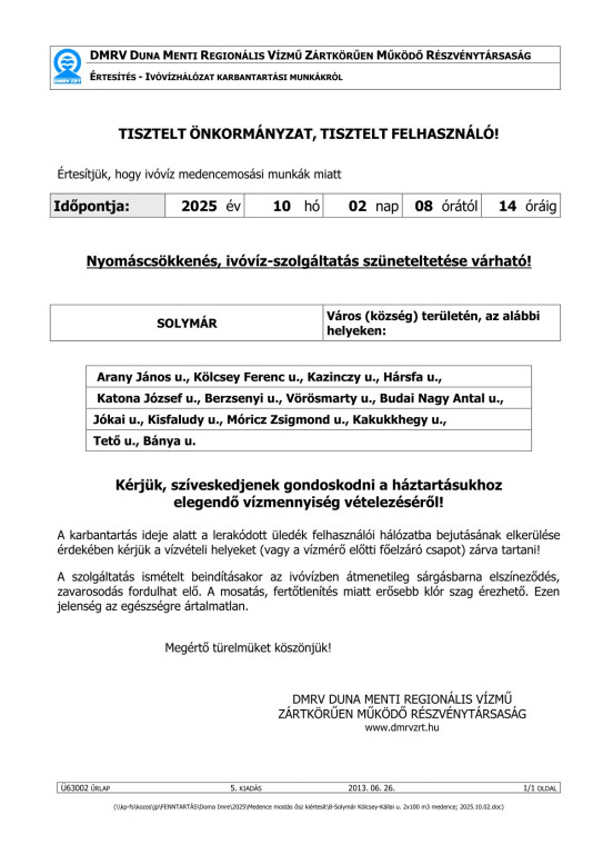 Nyomáscsökkenés, ivóvíz-szolgáltatás szüneteltetése várható 2025.10.02-én!