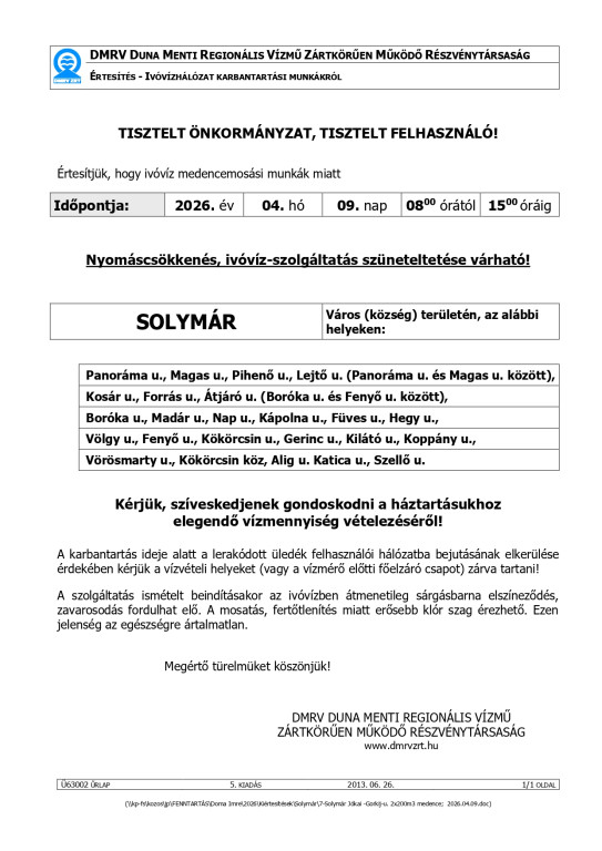 Felhívjuk szíves figyelmüket, hogy 2026.04.09-én csütörtökön az ivóvíz-szolgáltatás szüneteltetése várható a mellékelt tájékoztatóban foglaltak szerint.