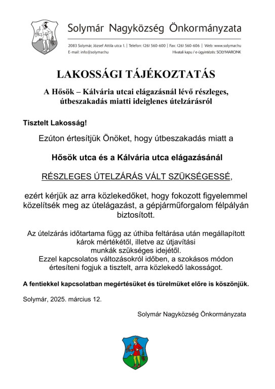 Lakossági tájékoztatás részleges útelzárással kapcsolatban!